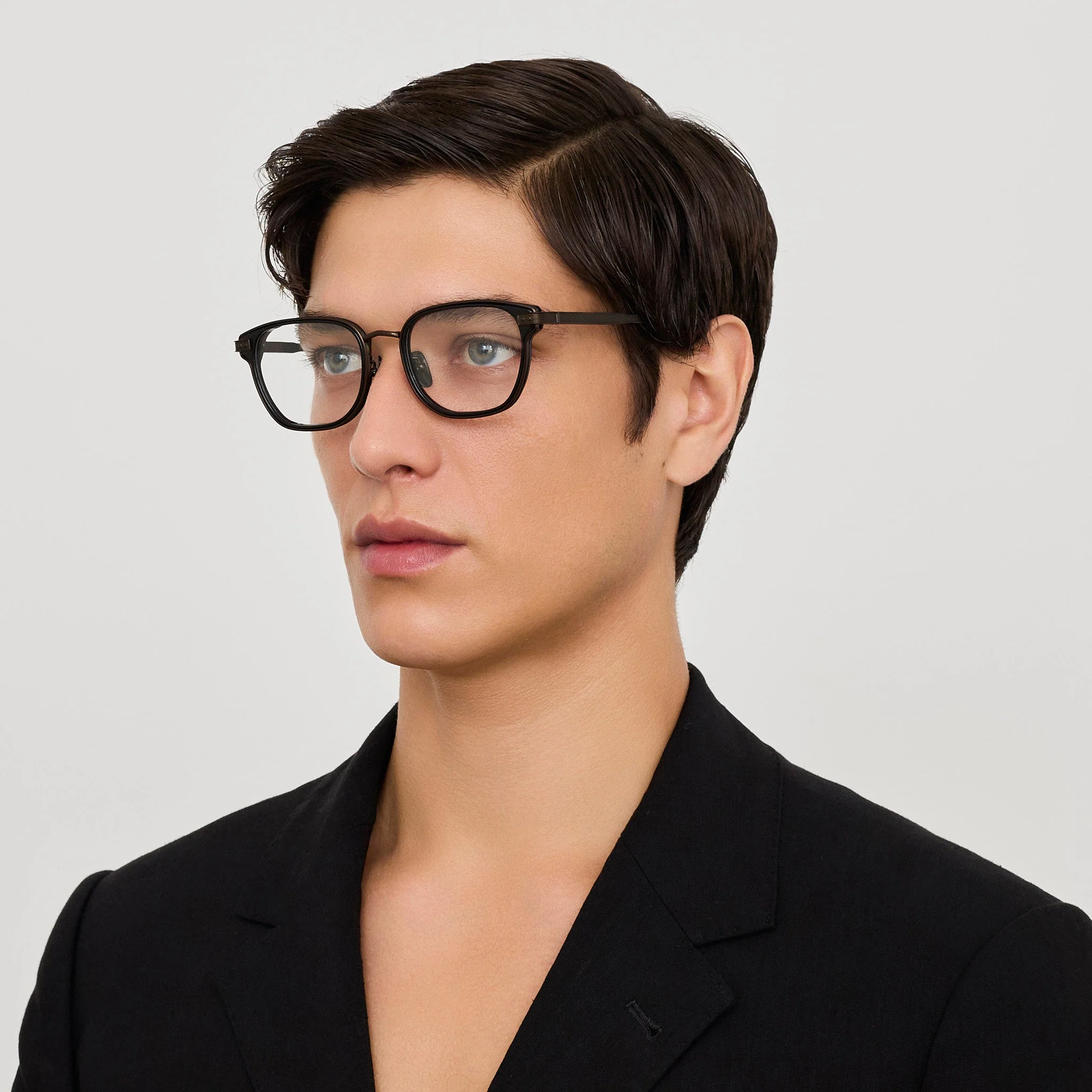 An elevated D-frame silhouette crafted from Italian black acetate and contrasting mat nickel pure Japanese titanium temples. This refined optical frame features a strong architectural brow line, sculpted temples, and adjustable nose pads for enhanced comfort.