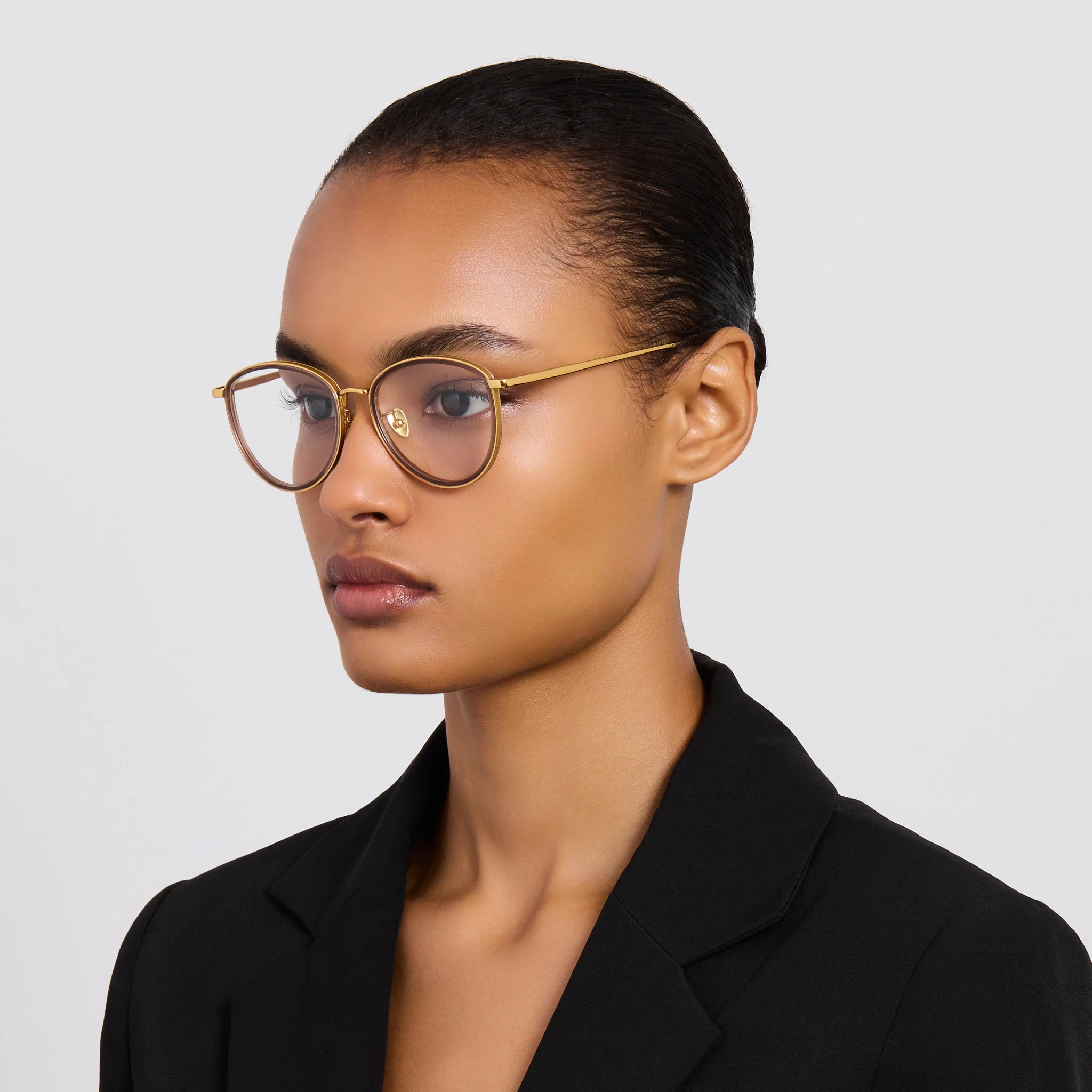 Sculpted from matt champagne pure Japanese titanium and featuring brown rim, the Dahlia in Black is a refined oval optical frame that balances delicate engineering with timeless elegance. Adjustable nose pads ensure all-day comfort, while the lightweight construction offers an effortlessly refined silhouette.