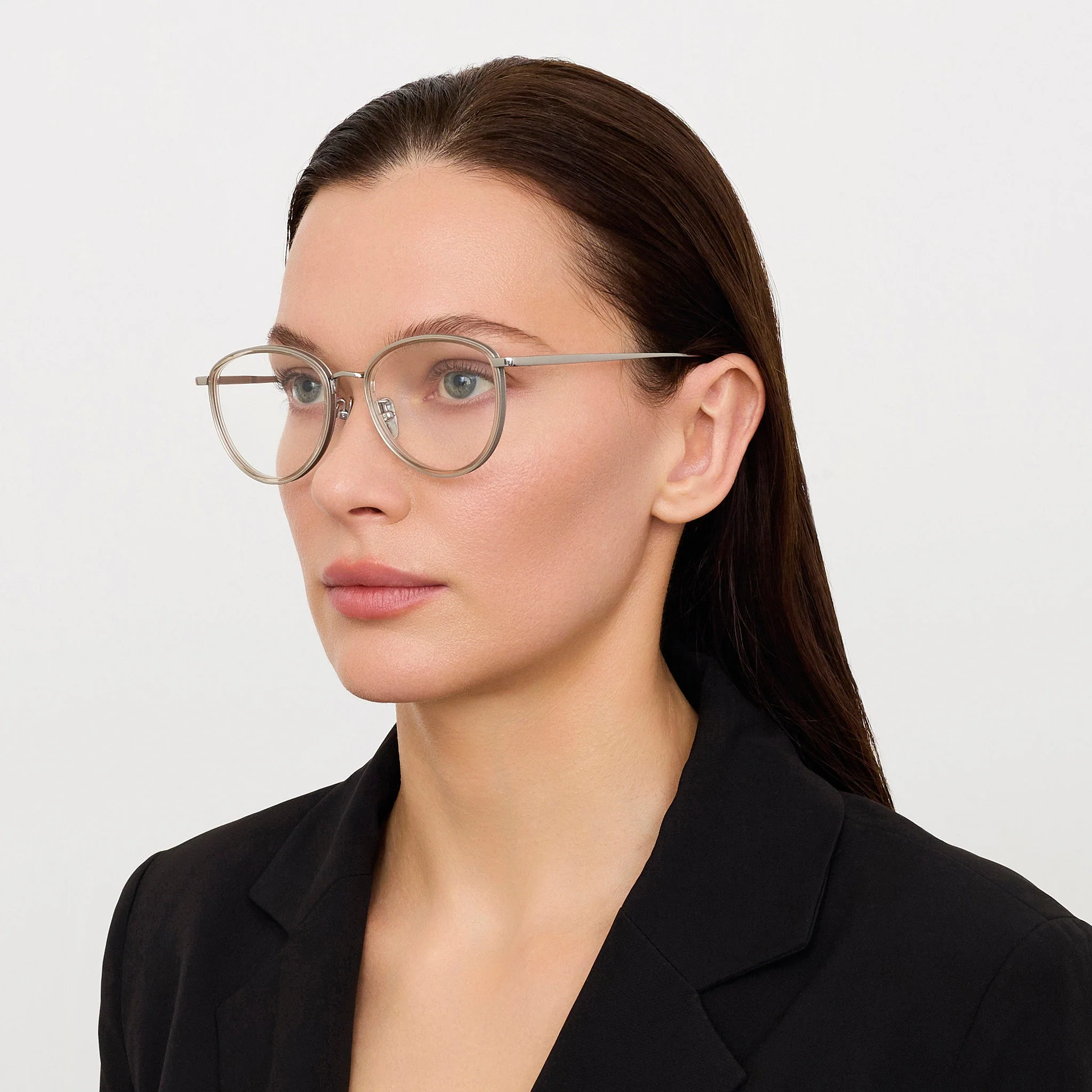 Sculpted from 22K white gold-plated pure Japanese titanium and featuring truffle rim, the Dahlia in Black is a refined oval optical frame that balances delicate engineering with timeless elegance. Adjustable nose pads ensure all-day comfort, while the lightweight construction offers an effortlessly refined silhouette.