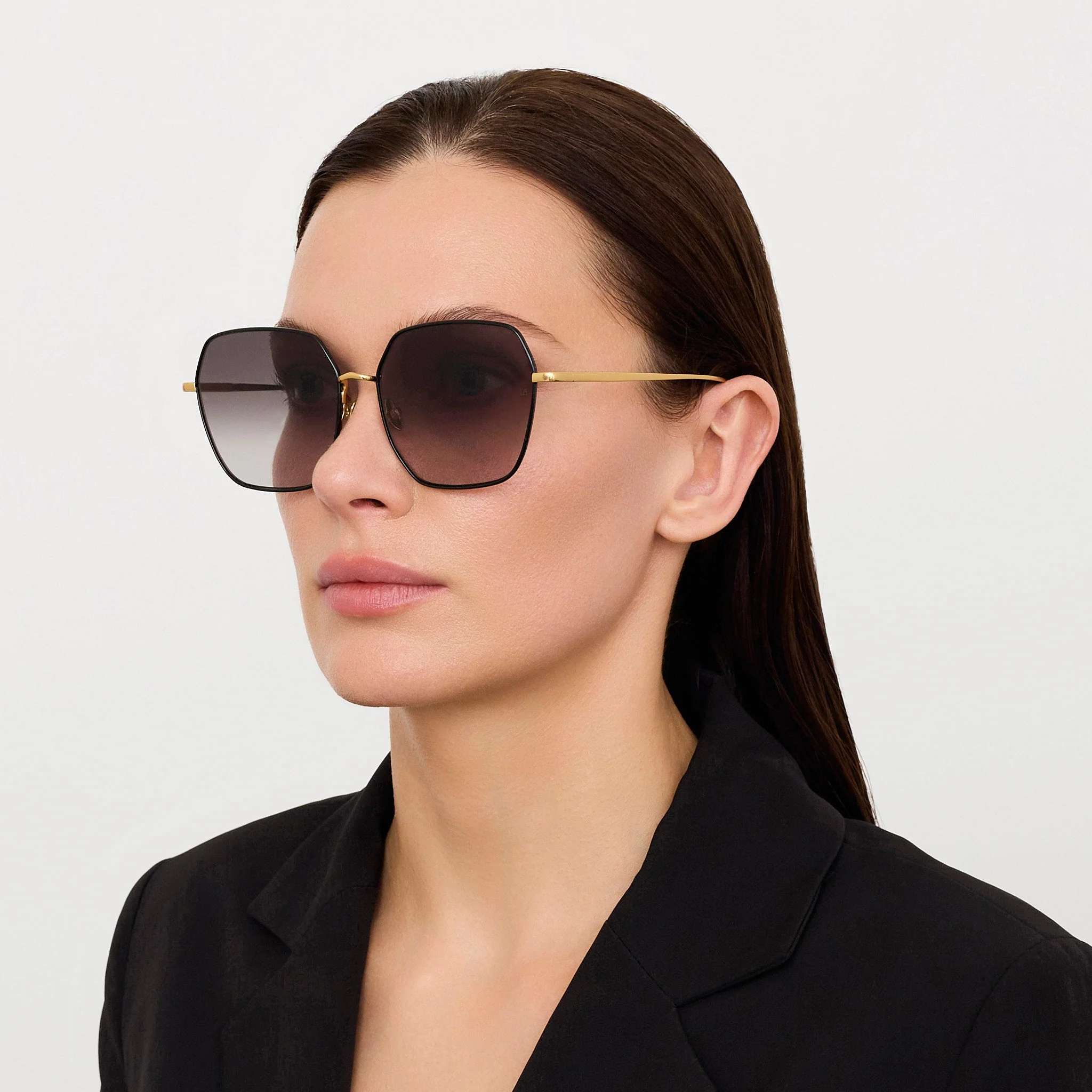 Introducing the DARCIE frame. These sunglasses feature an oversized silhouette crafted from ultra-lightweight Japanese titanium plated in 22 karat yellow gold. The black rim add bold contrast to the luminous gold structure. Finished with gradient grey lenses offering full UV protection, the frame features adjustable nose pads for a tailored fit.