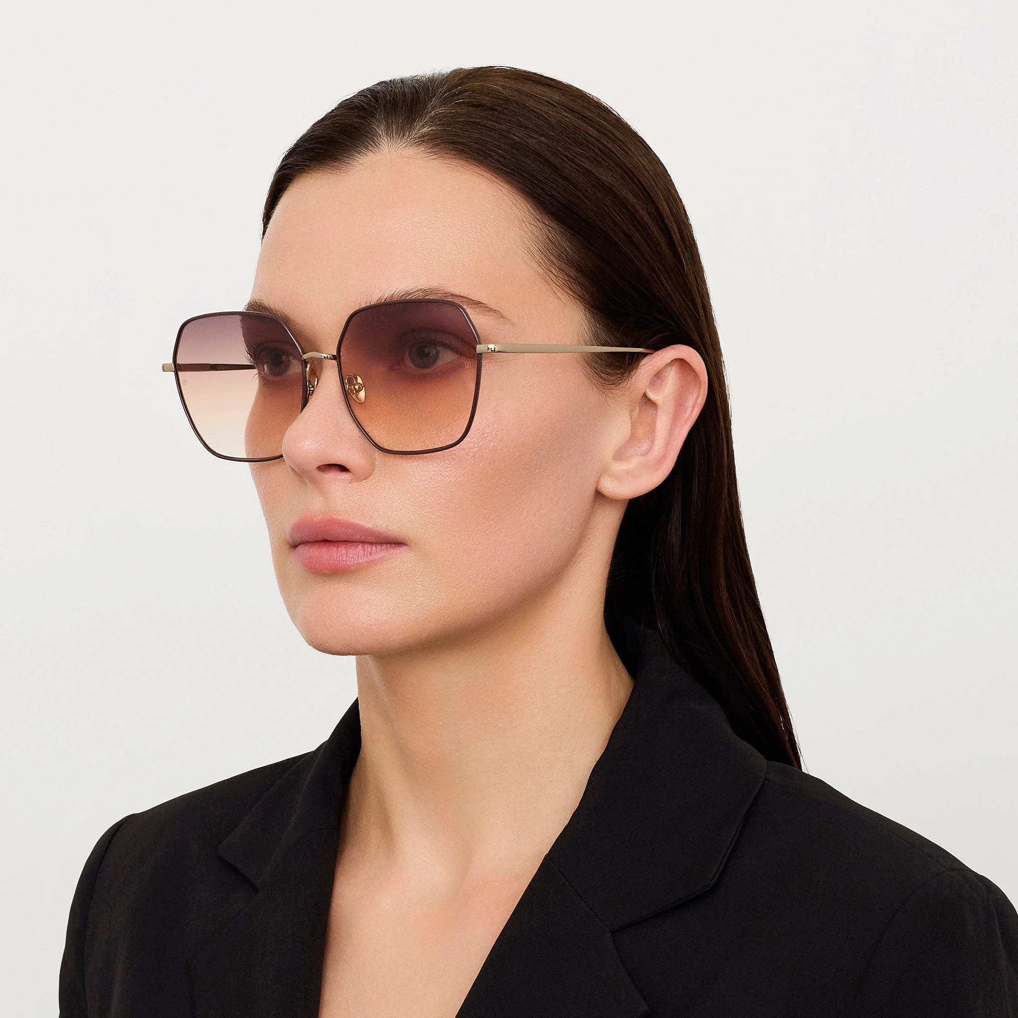Introducing the DARCIE frame. These sunglasses feature an oversized silhouette crafted from ultra-lightweight Japanese titanium plated in 22 karat light gold. The brown rim add bold contrast to the luminous gold structure. Finished with ash gradient lenses offering full UV protection, the frame features adjustable nose pads for a tailored fit.