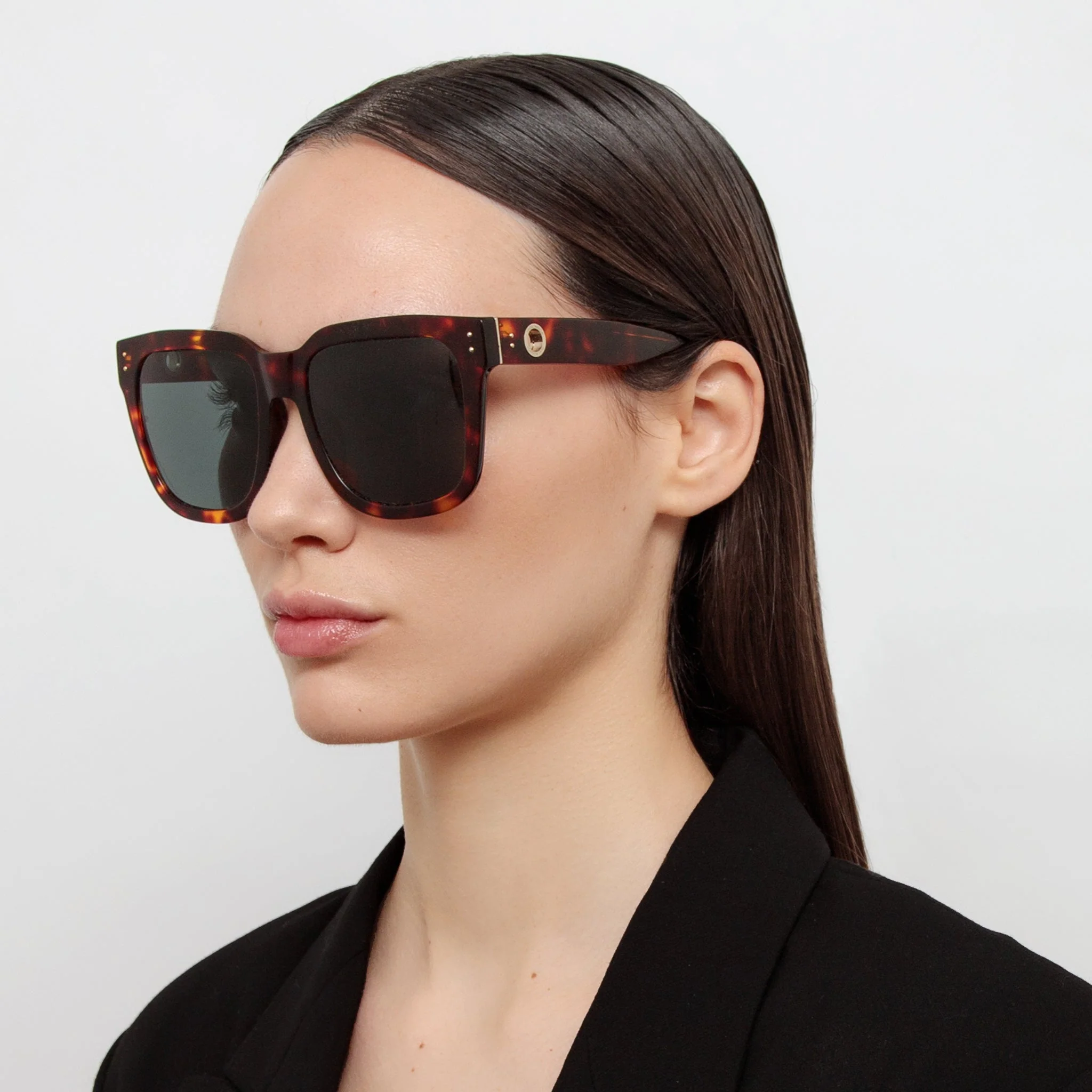 The oversized square Freya sunglasses are an example of simplicity executed with finesse. The frame is crafted from dark tortoise shell acetate, hand polished for smooth soft edges. The style has sculpted nose pads and temple tips to ensure a comfortable fit.